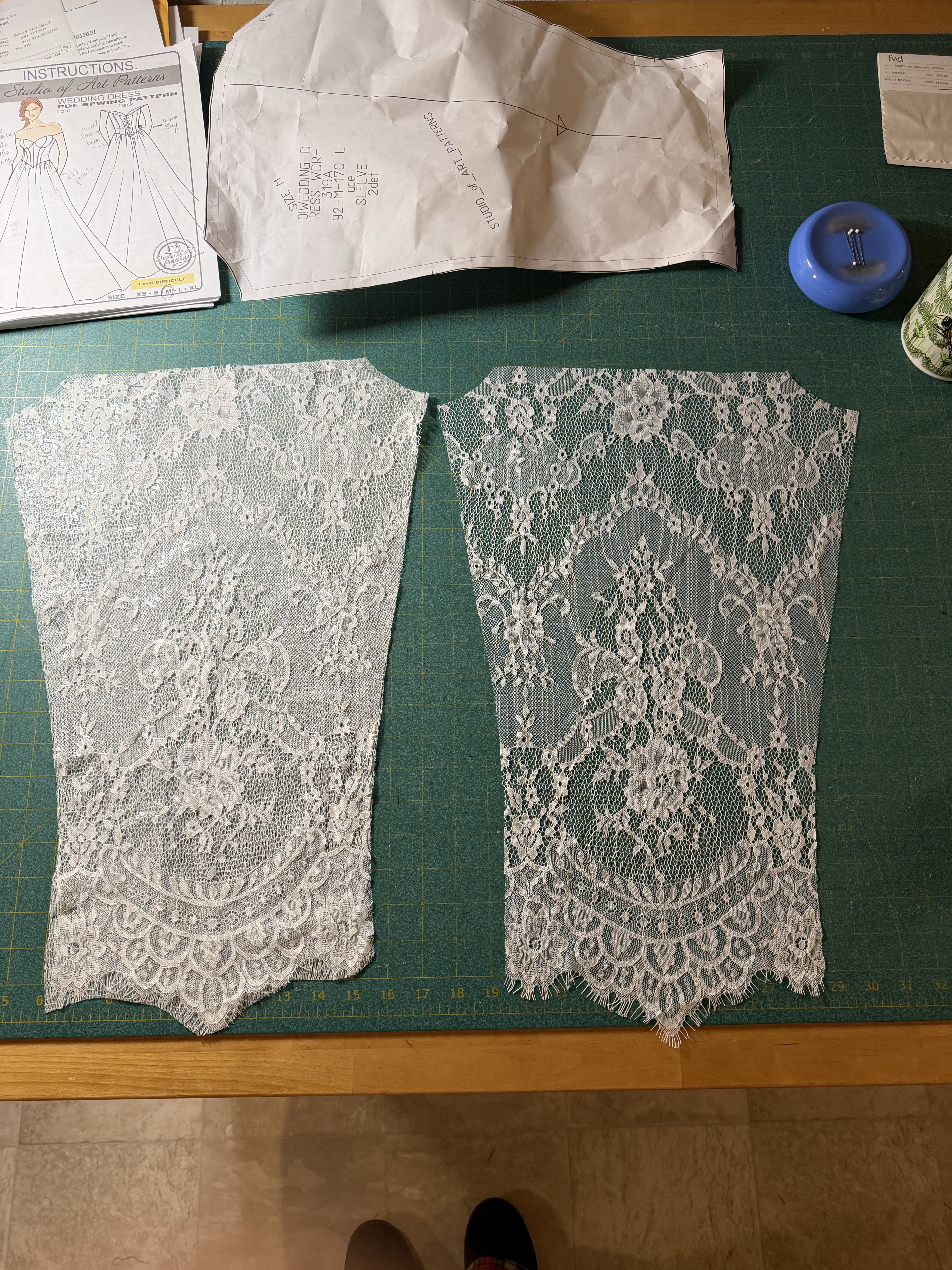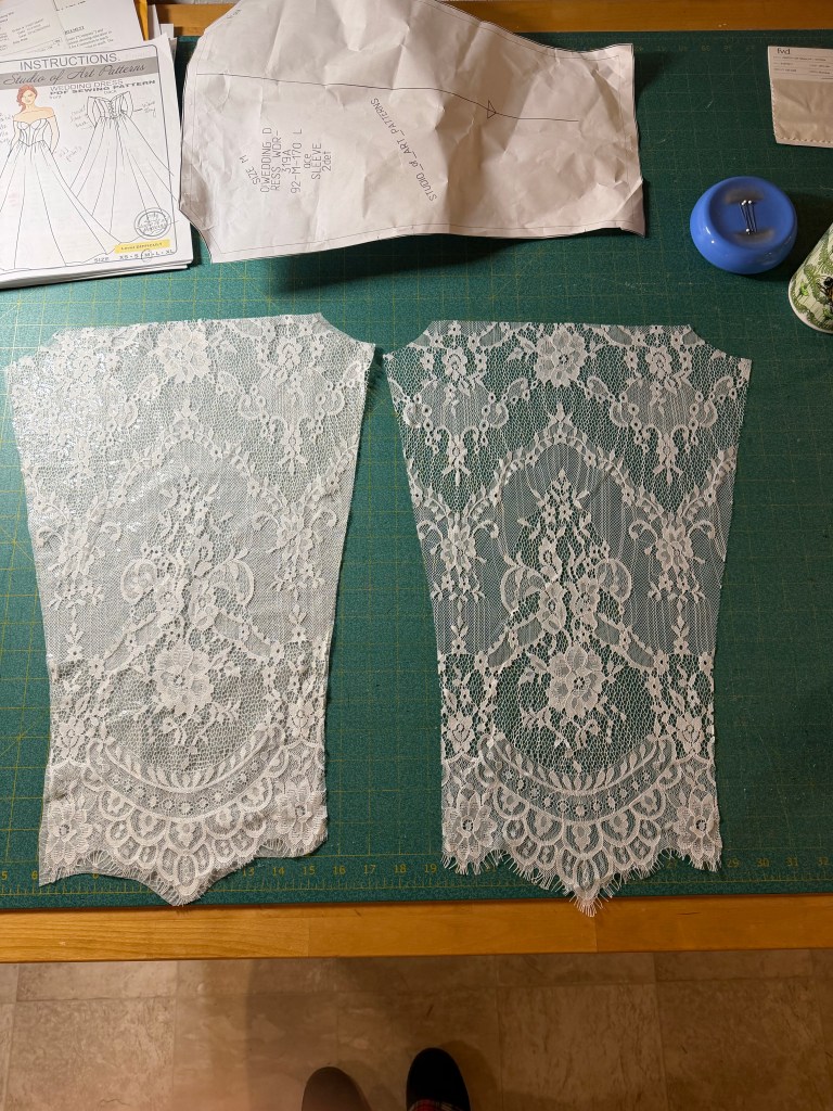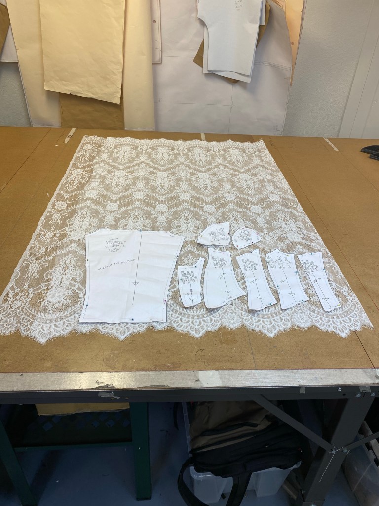 The bodice pieces cut out in lace with underlining pinned and ready to be basted together by handThe upper skirt pieces marked and ready to be basted together by handOne half of the lower skirt portion ready for basting the layers together.