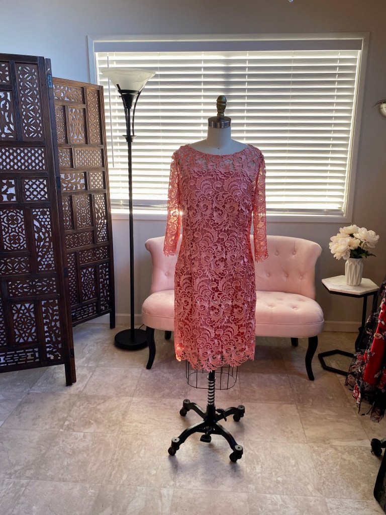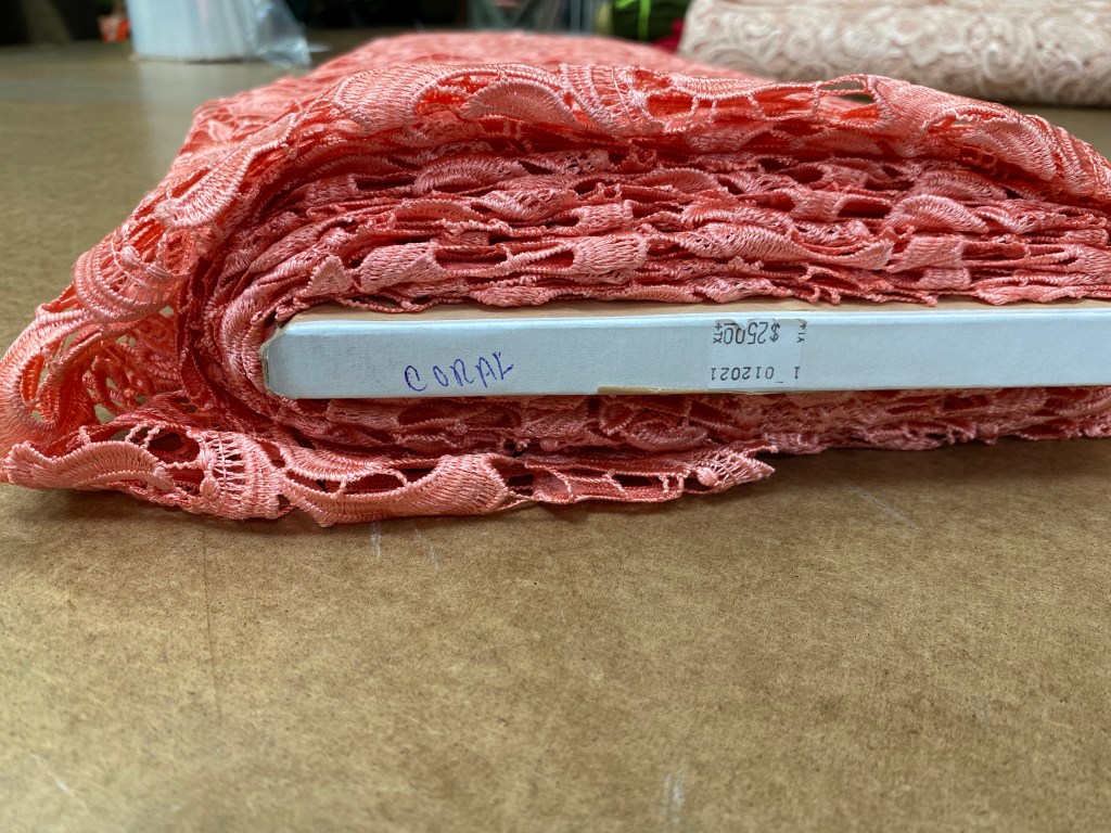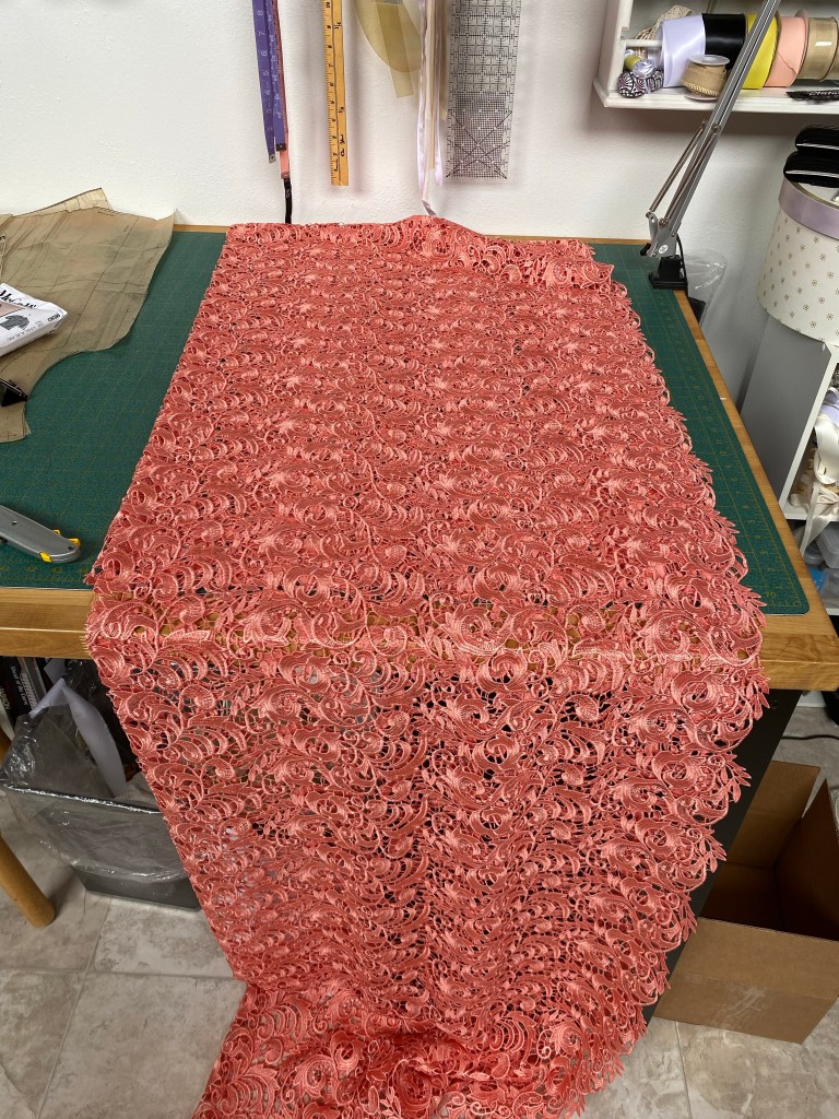 I purchased a 1/8 of a yard large swatch of this color, as well as the coral pink lace that I thought would look really nice on Ardith. I made note of the end of the bolt so that I could call back with an order once I got home if she chose this fabric.