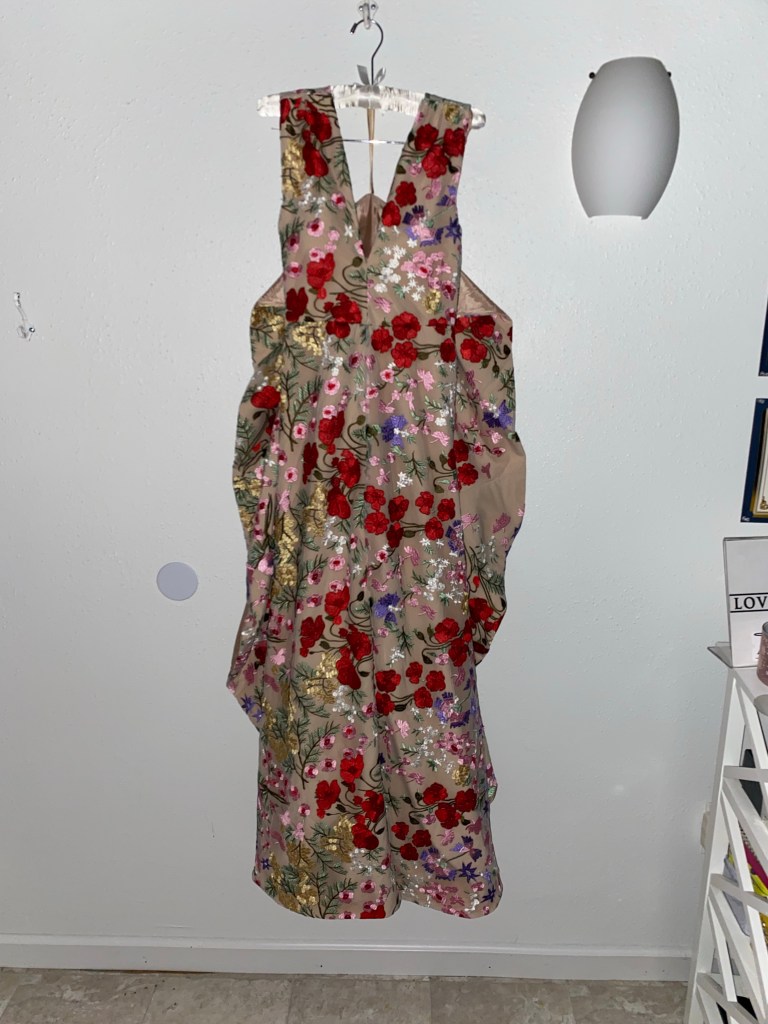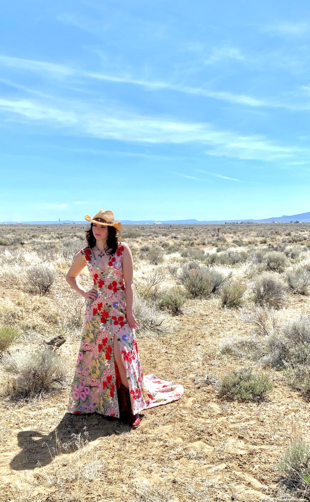 I wanted a sexy slip dress style for the collection, and thought I already have plenty of white dresses, why not have some pink for a pop of color. I brought a large swatch of my floral printed ball gown fabric to the fabric store, pulled out one of the colors from the print, and purchased 6 yards of material plus 5 yards of rhinestone trim for the straps.