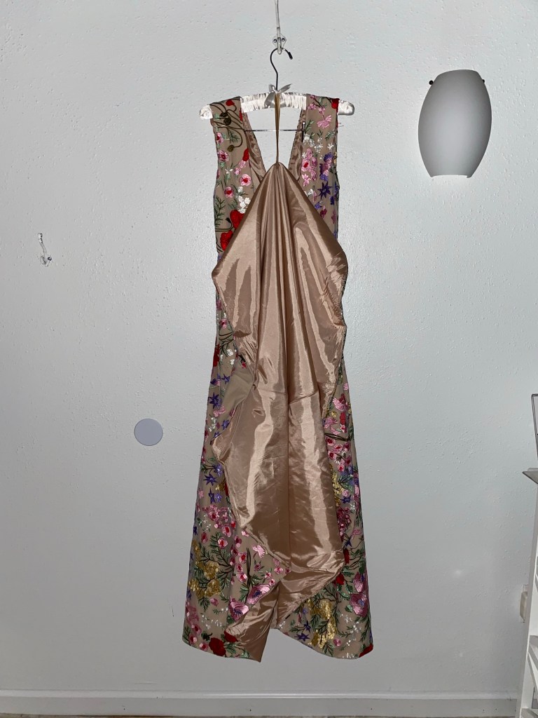 Of course, I made changes to the pattern including cutting the front bodice out on the fold instead of having a center front seam. Also I fully lined the entire jumpsuit to avoid seeing through the garment and to give it a more “luxe” feel. I made a matching sash and slapped on some of my embellished tulle to act as a detachable train.
