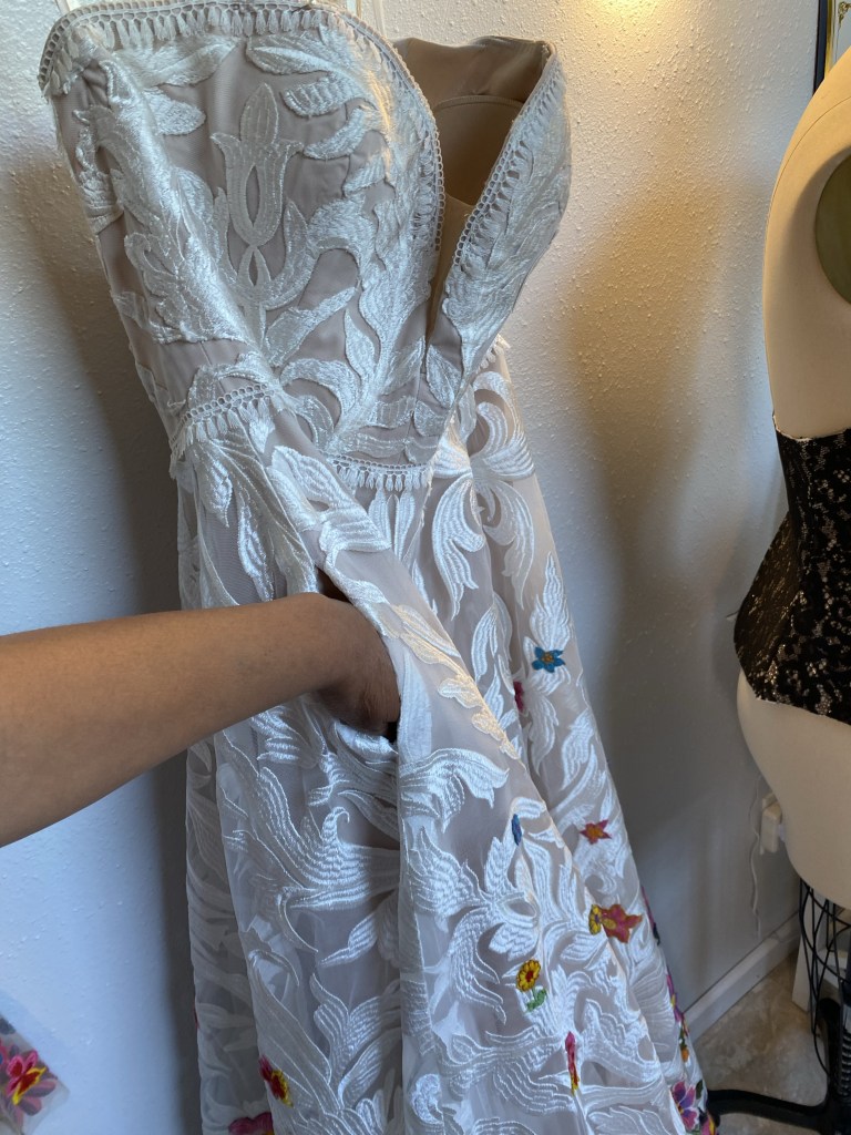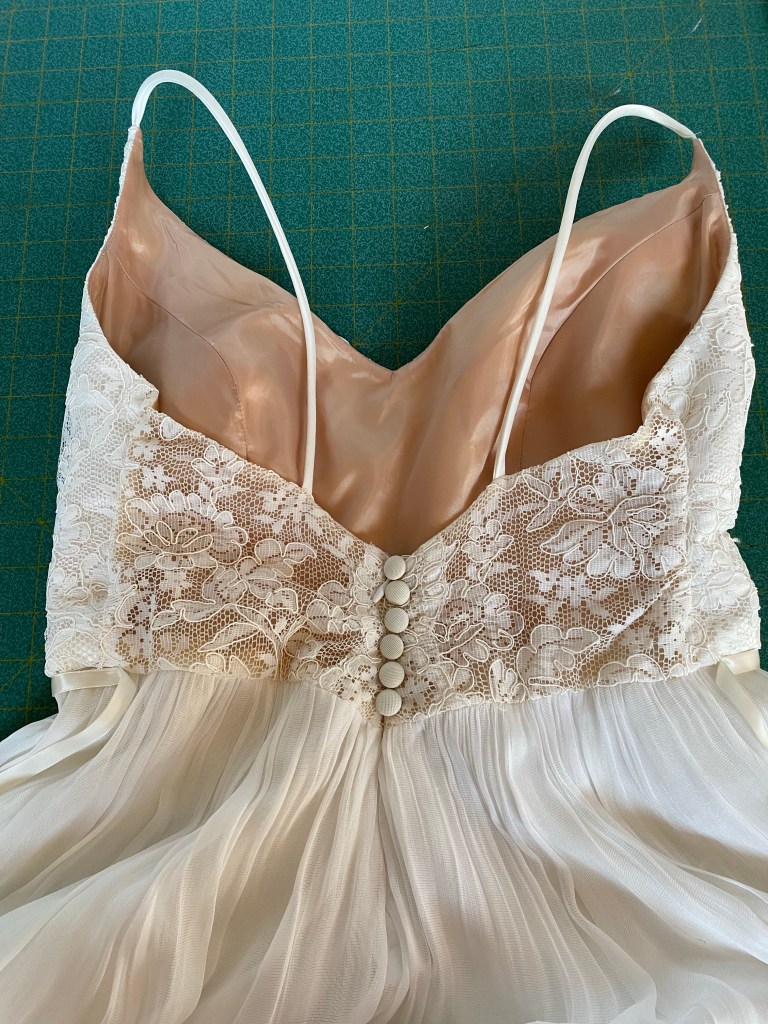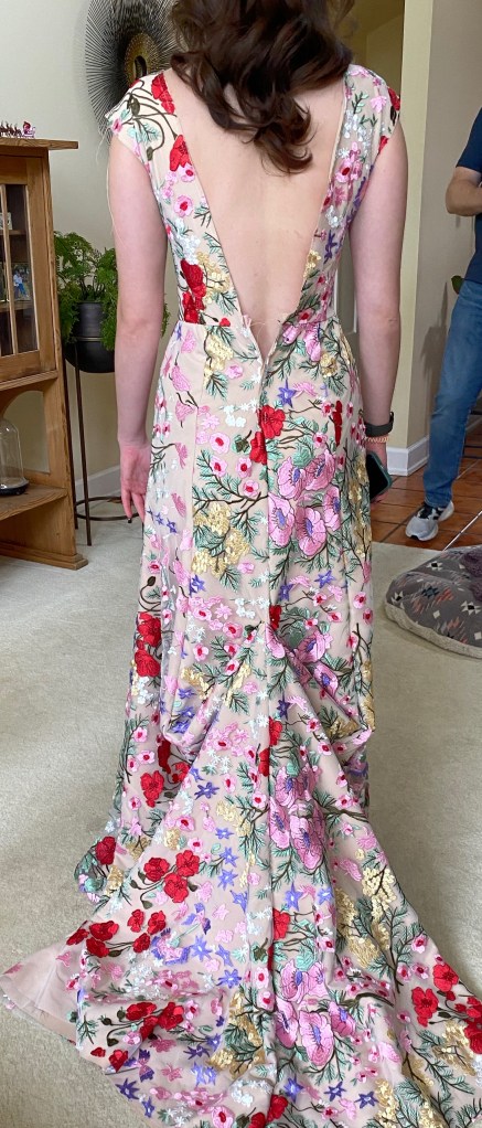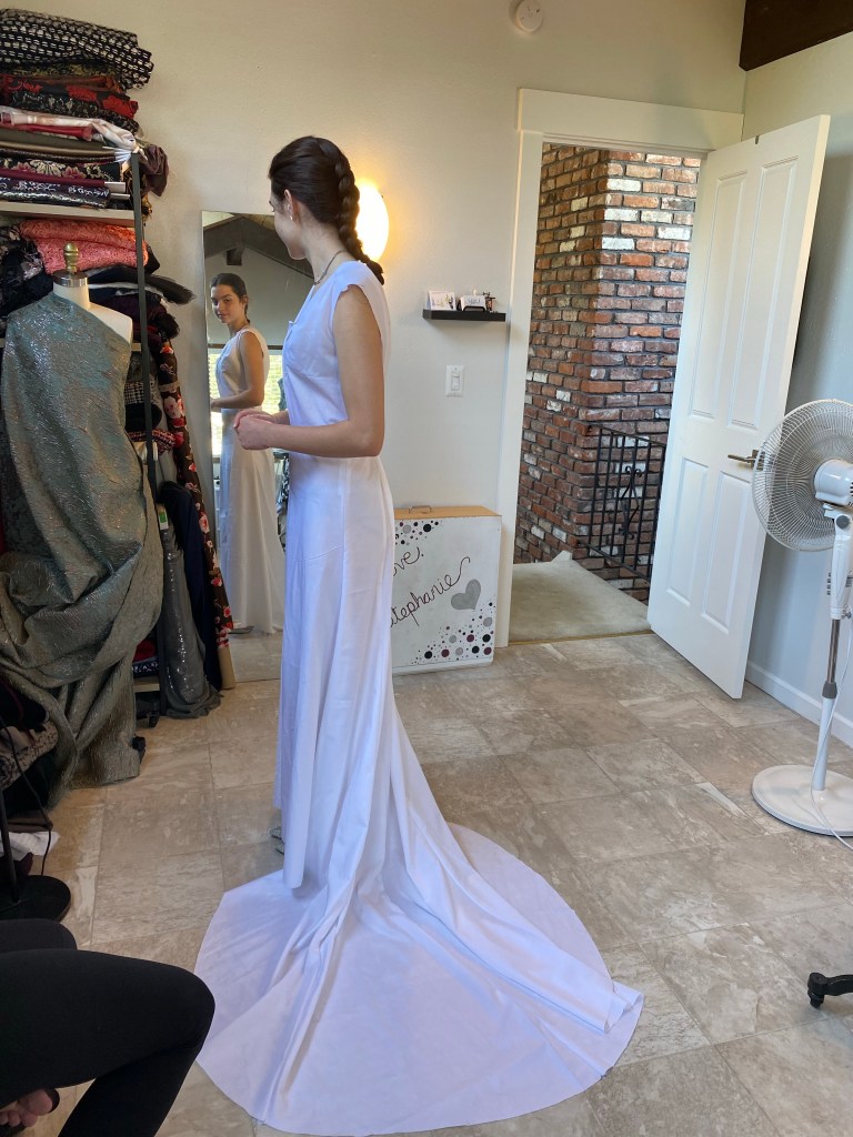 - I lengthened the hemline and added more of a slight train to the back of the dress (who doesn’t like a little train drama, right?).