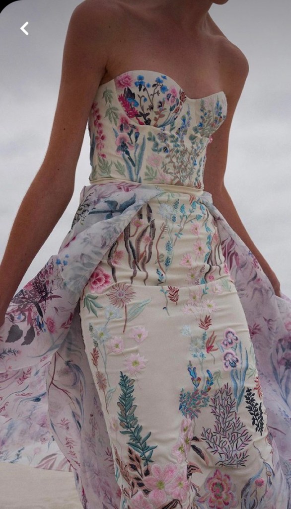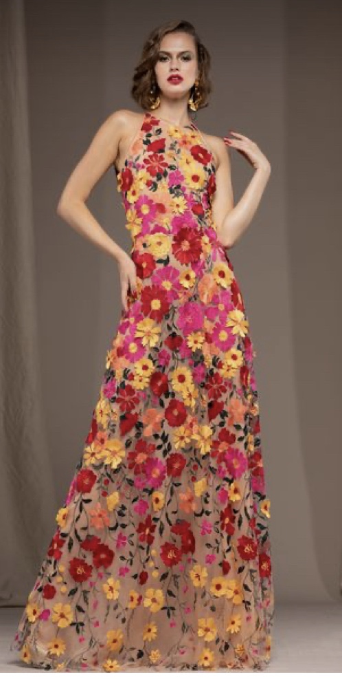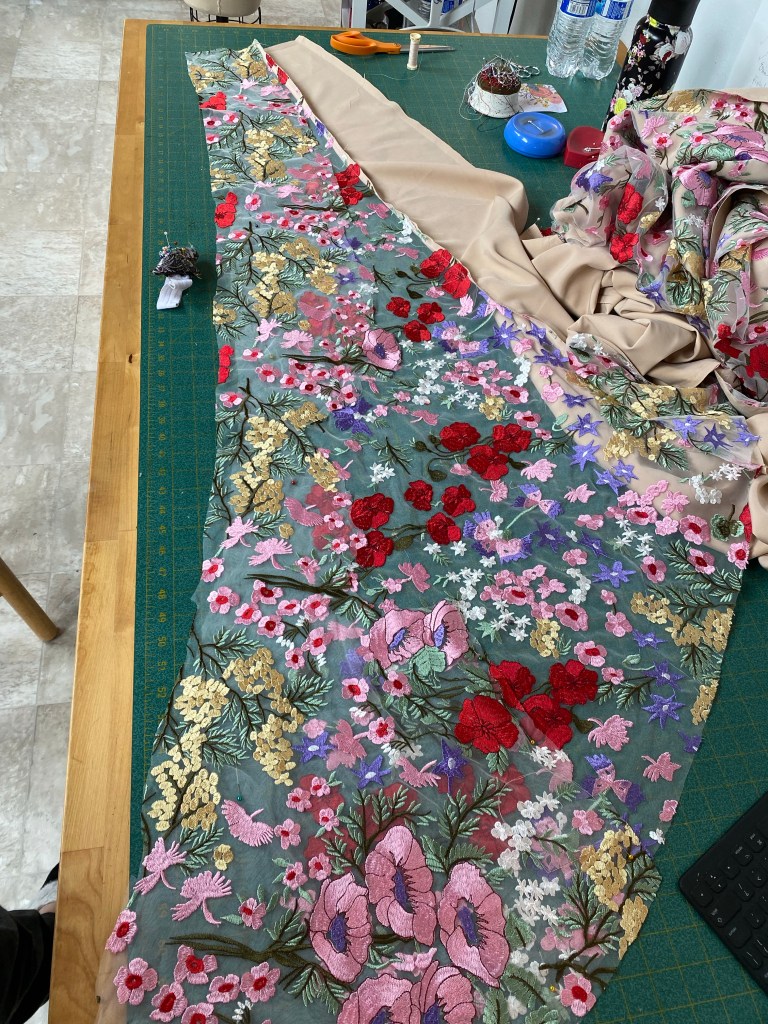 Back to the time being…then began the actual work of editing down to what makes sense, what flows together in a collection, and sticking to a theme. I began to conceptualize the collection with the one fabric that really spoke to me, a floral printed mikado (a type of satin) that I had purchased from Mood Designer Fabrics a few years ago. I just loved the colors and the “growing” effect of the print. I thought it would be a wonderful, big ball gown with a big skirt to show off the fabric. Hence, the Floral Garden Bridal Collection was born!
