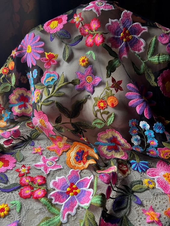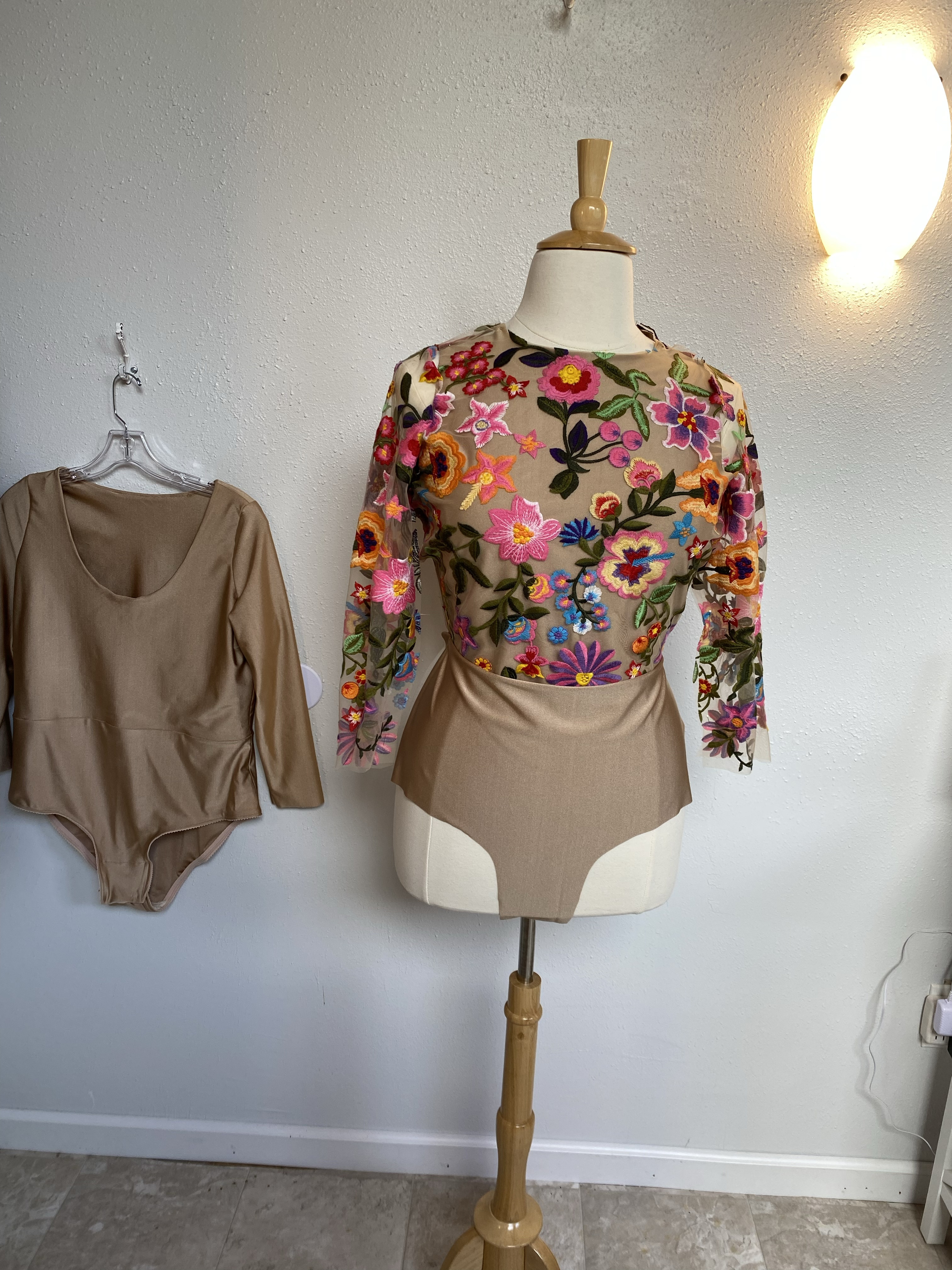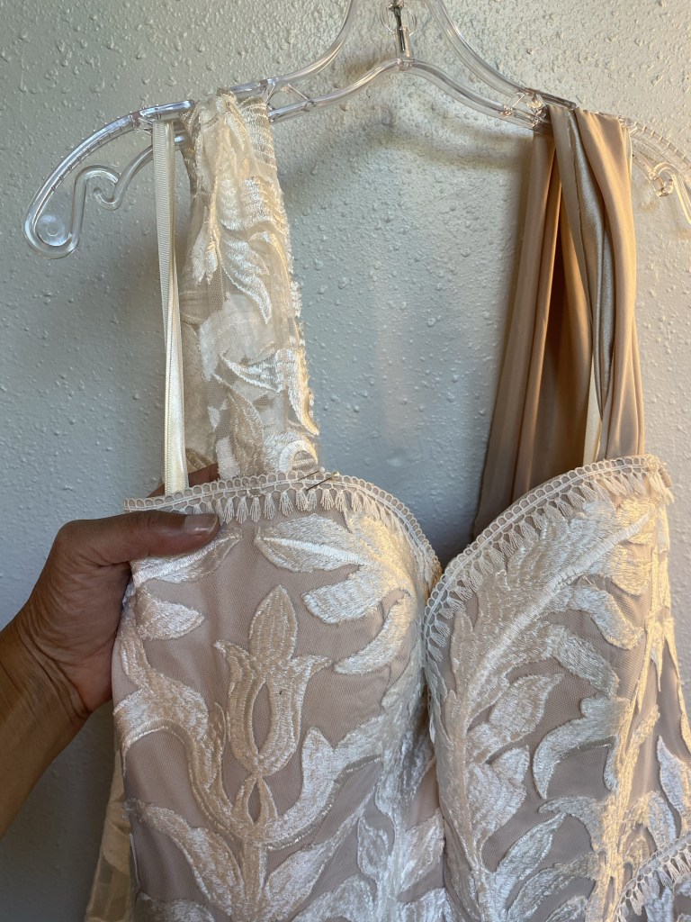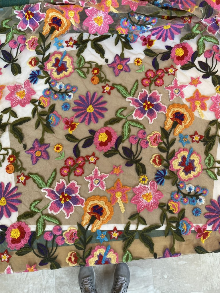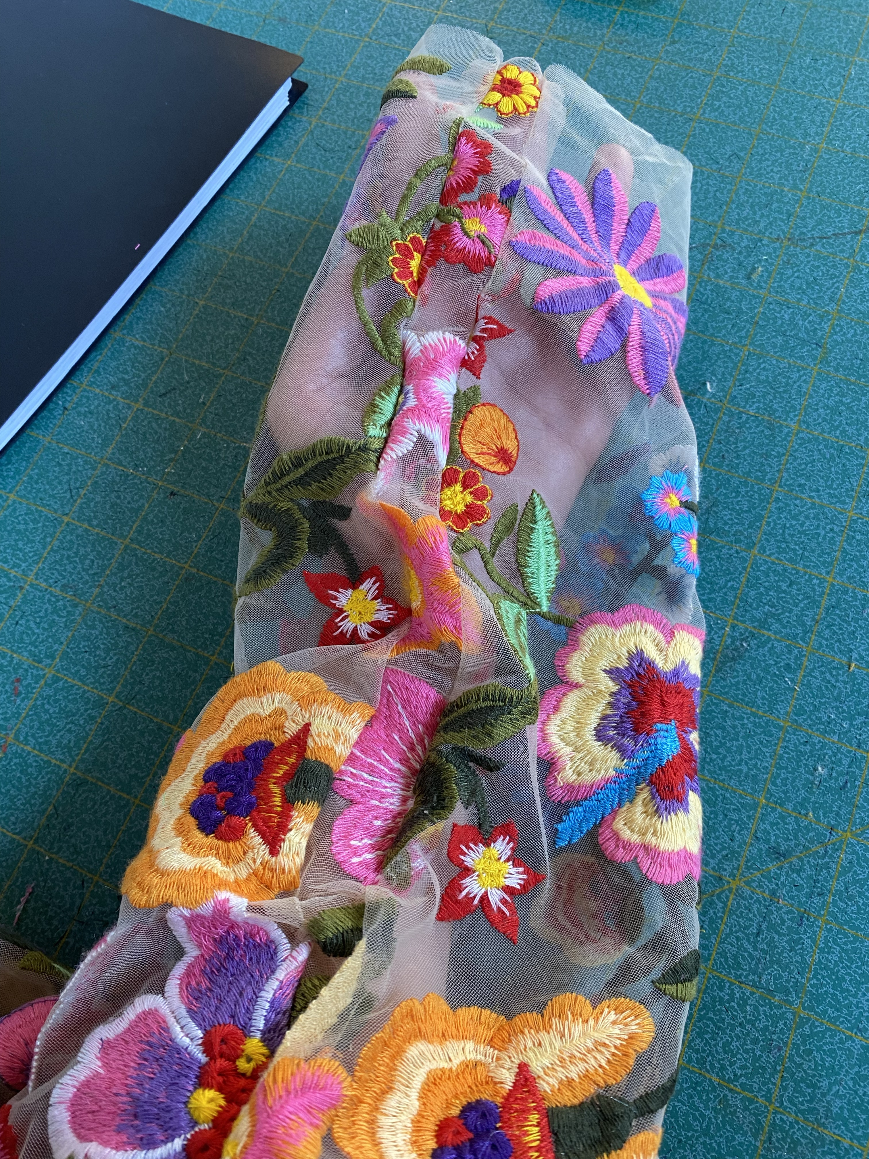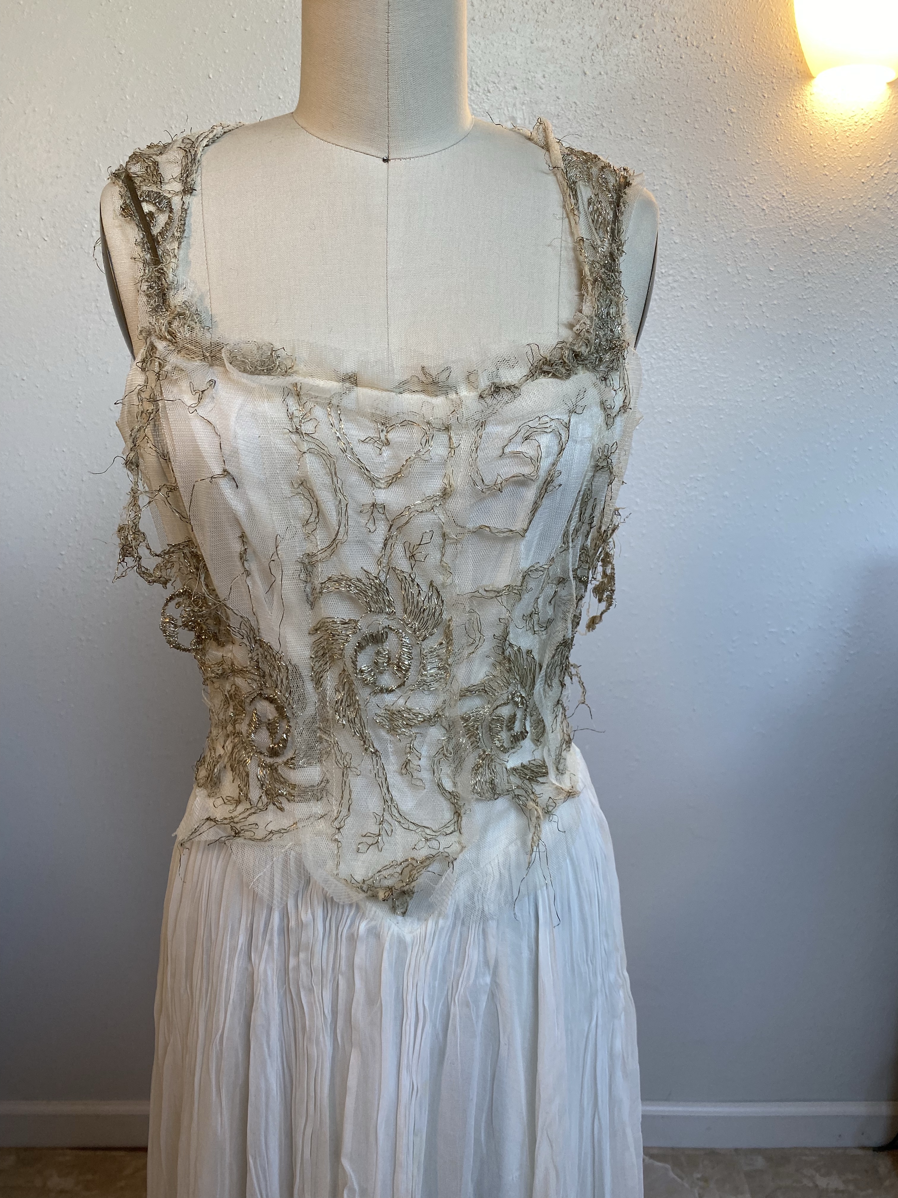 I wanted to create a gown with movement and romance, one that would appear to float on the bride. I had this lovely 3-dimentional mesh lace with sequins and little chiffon petals that looked like butterflies. I bought this fabric on clearance at Joann Fabrics over a year ago and knew I how I wanted to use it.
