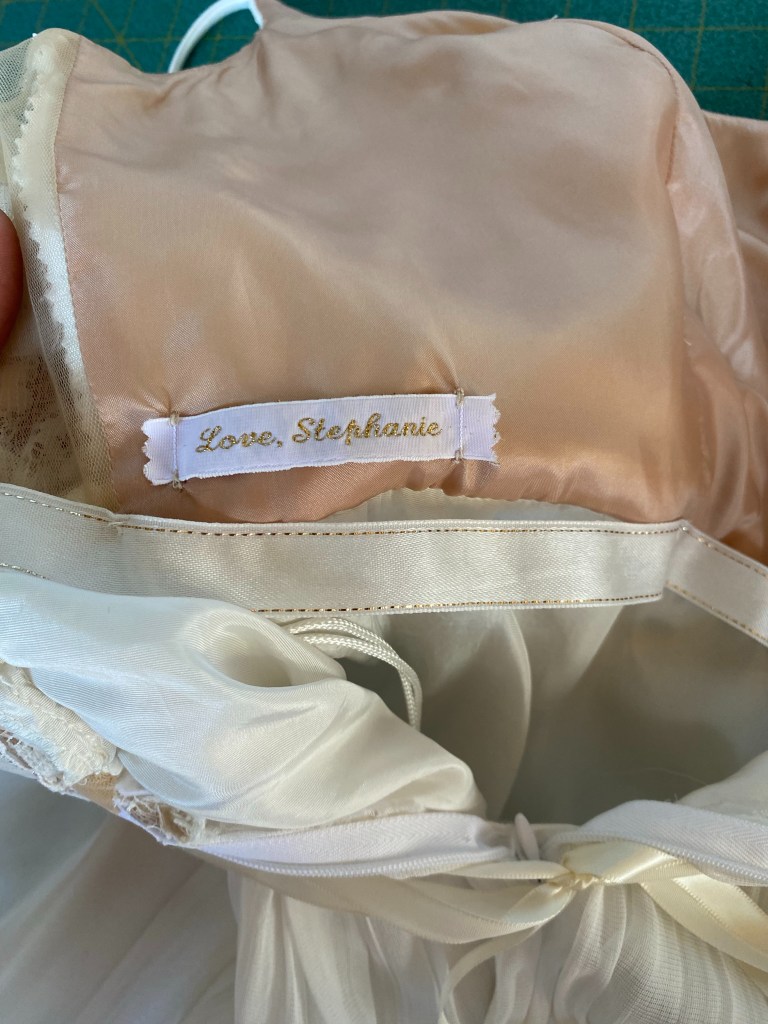 I got to cutting out the 4 layers of this gown: the lace, the peach organza underlining, and 2 layers of a soft chiffon-like poly to be lining. That was a LOT of cutting, especially difficult were the large pattern pieces of the skirt and back of the skirt with a slight train. Keeping track of the pieces was important as they looked alike, especially the skirt front and side front pieces. I used a Burda sewing pattern to begin with, but made so many changes to it that I can’t really call it that pattern anymore.