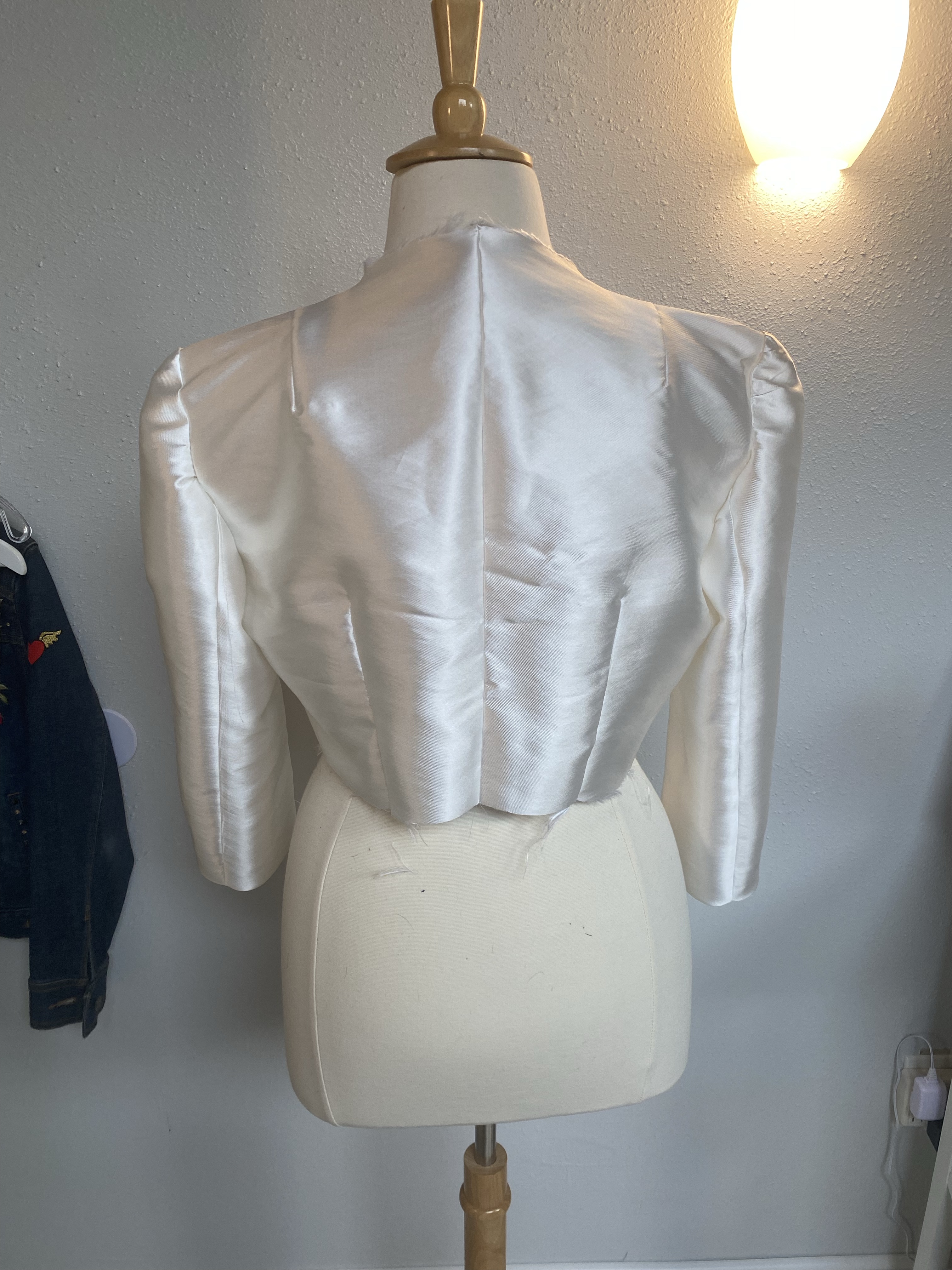 I couldn’t have a bridal collection without the big finale look, so I added a dress to my line up with another ballgown in a very pale peach toned satin. I used a wonderful pattern from Studio of Art Patterns which I found on Etsy. It featured a mesh insert bodice, wide waistband, a gorgeous open slit in the skirt, pockets and a train. I also opted to add little covered buttons, 72 of them to be exact (thank you Robbyn for making all of those little suckers!), all the way down the center back of the gown.