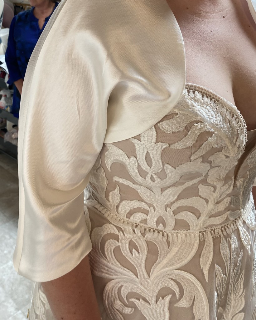 I wanted to have one option in my collection with an overskirt as I love the idea of a transformation in the bridal outfit. She could wear the overskirt for walking down the isle, then remove the overskirt and reveal a lovely sheath dress underneath for the reception. Genius!