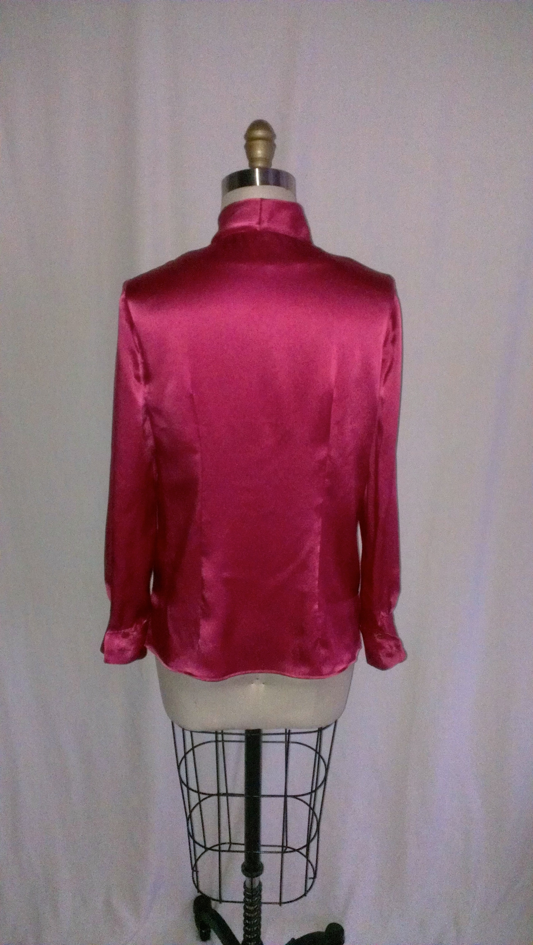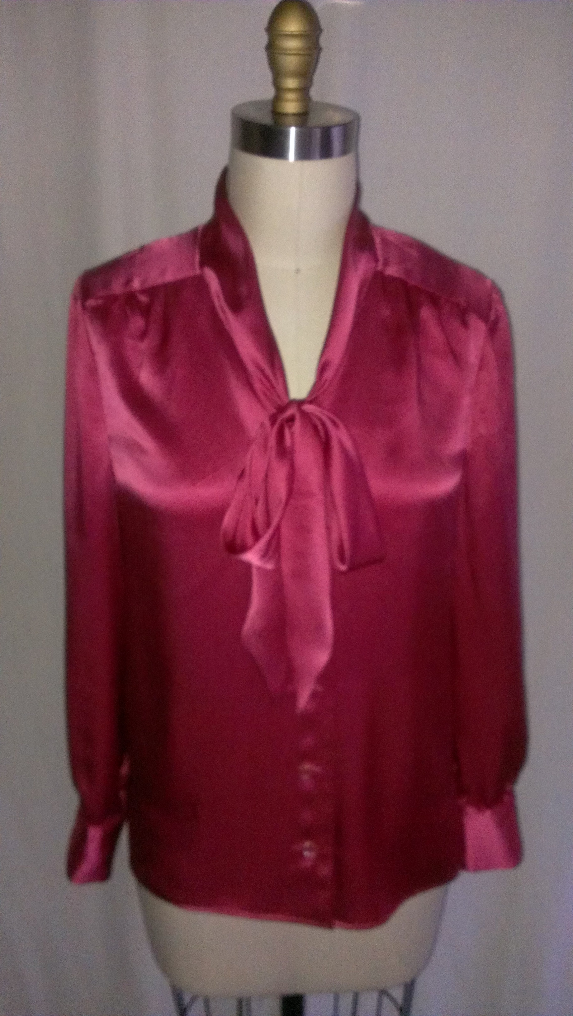 This beauty I made for my stunning brunette friend (you know how you are 🙂 ) as a gift. I have had this pinky/coral colored lustrous silk charmeuse for about two years now, keeping Her in mind to make a top for. I finally had her body measurements (I measured them for her on Thanksgiving 2014 before dinner), and figured she would look really nice in a lower cut, tie neck blouse, in a favorite color that she loves, not to mention looks really pretty on her.