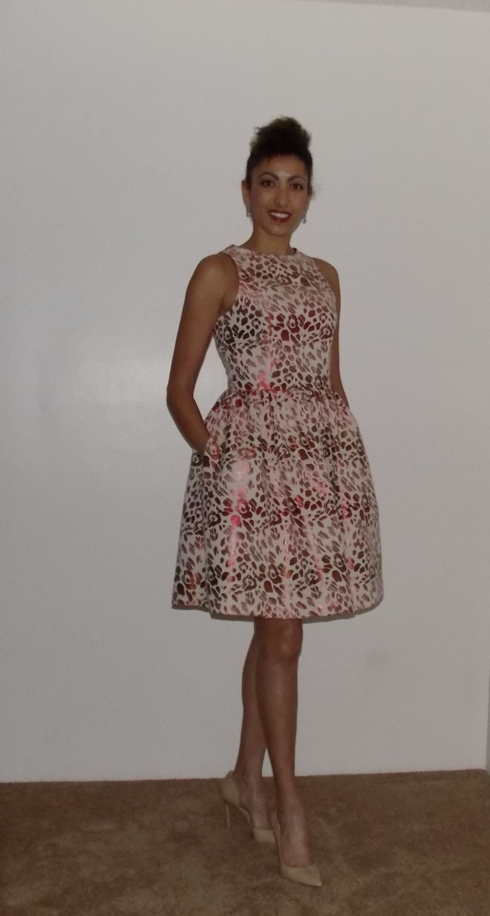 The dress was fairly easy to construct with a basic princess seam sleeveless bodice and full pleated skirt and deep pockets, lined by the same pattern pieces for the bodice and different patterned pieces for a gathered skirt lining.