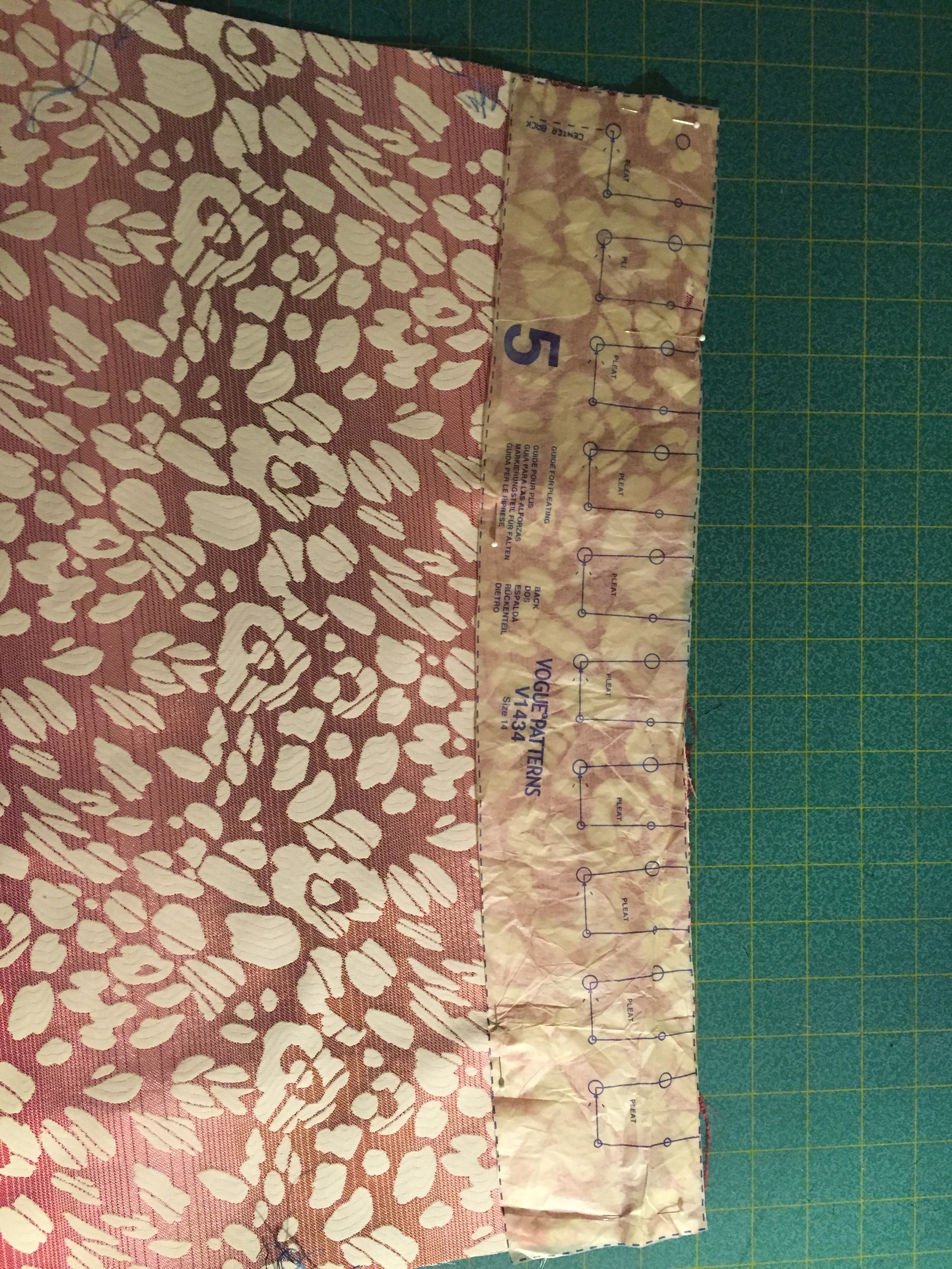 I found that this would have been helpful had all my pleat tracing work had actually shown up and stuck to the brocade fabric once it came time to sew them. Instead, I actually held the guide up to my fabric as I pinned each pleat in place, then carefully basted them down: