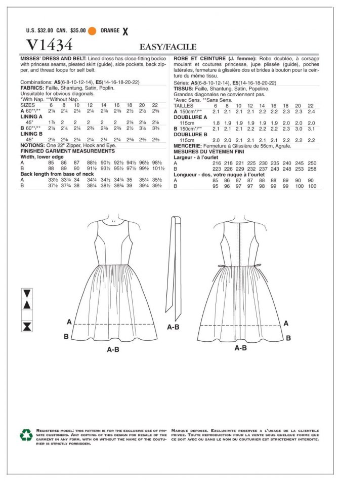 Once a pattern is purchased, they send you the PDF pattern and instructions to download and print at home or a copy shop. They include multiple size files and all of the information needed to construct the garment including a detailed size chart, suggested fabrics types including any interfacing, lining or stabilizing fabric yardage and notions needed, pattern cutting layout, and sewing instructions, and a few photos of a finished garment made from the pattern. The sewing instructions are quite sparse, somewhat confusing, and assume that you have a good amount of prior dressmaking experience and ability to construct a dress. In addition, the sewing terms and language are not always clear, there are no photos or illustrations of the construction process, just the step-by step words themselves, so you are somewhat on your own for figuring out the difficult parts, therefore these patterns are not for the beginner sewist by any means. However if you have any questions or need help with the sewing process, they are readily available to help and respond right away which is great.