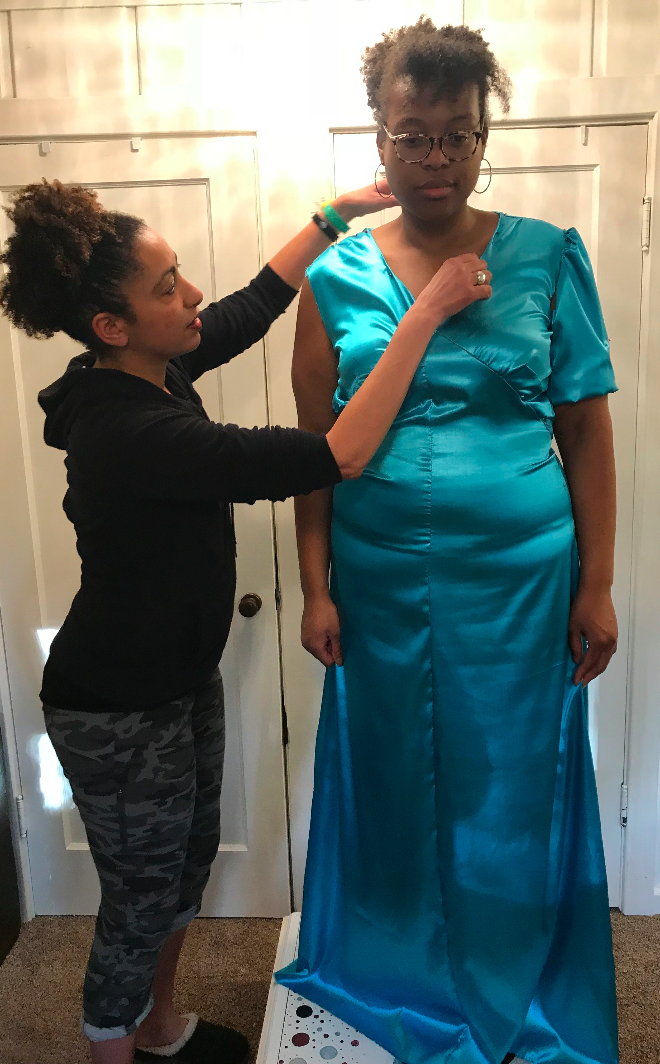 Fitting #1: we worked out a good deal of fitting and design adjustments to the gown.