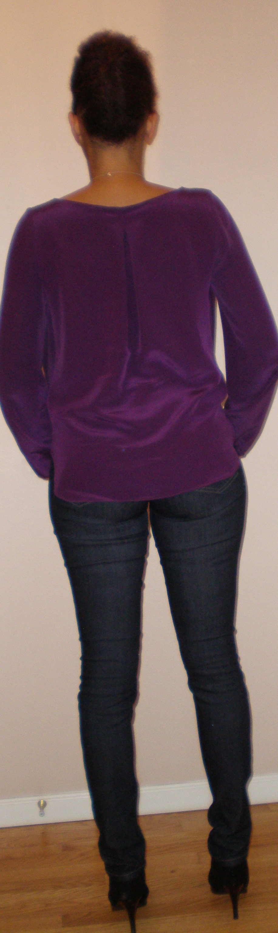 It is hard to see from the photos and in this inky black color the luxuriousness of this blouse and the bust dart, but trust me, it’s really nice! I have another identical one already cut out and ready to sew for myself, or to sell to someone if the opportunity arises. I have other nice silk materials that I could whip up into this top as well. It is a very simple style, but I think it will look great with skinny jeans, tucked into a pencil skirt, under a jacket or cardigan over it, and a with nice necklace or scarf around the neck. It is a great basic tank in a luxe, soft silk with a little updated style twist. Gotta have it!