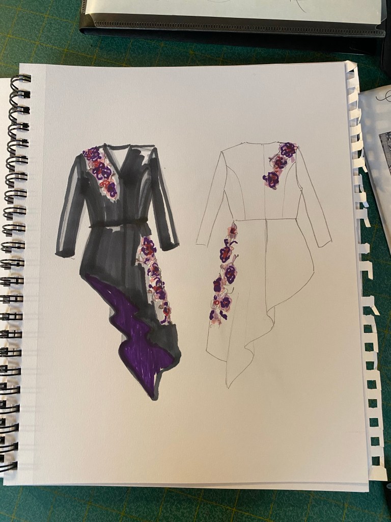 After searching through my own pattern collection of formal dresses, as well as through the usual avenues of obtaining commercial patterns, searching on Etsy I came across this new-to-me pattern company, Studio of Art Patterns. They had a very good selection of formal dress designs to choose from with details and features not found in other commercial patterns for sale. The patterns didn’t have much detail to the Etsy description or the other pertinent information readily available, such as fabric yardage needed to create the design, unless, as I discovered, you purchase and download the pattern. They have, however, added a really cool feature to the pattern images of an AI generated video clip of the dress as it is worn on the runway. Amazing!